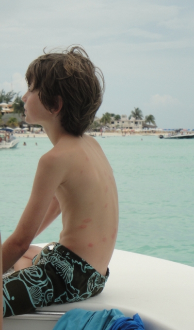 Ich durfte am Abend noch einmal die Einkaufsstraße besuchen um einen landesüblichen Gelsenstecker zu kaufen. An Jonas Rücken waren die Spuren der nächtlichen Gelsenattacken deutlich zu sehen.