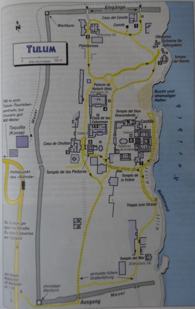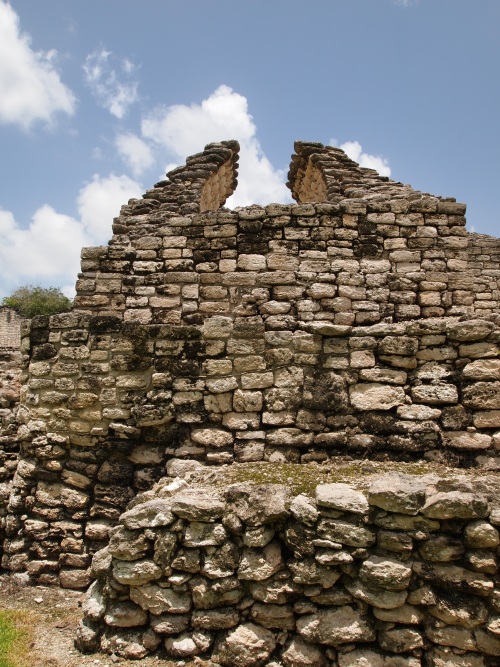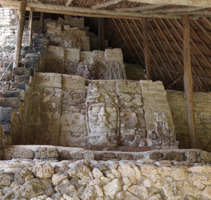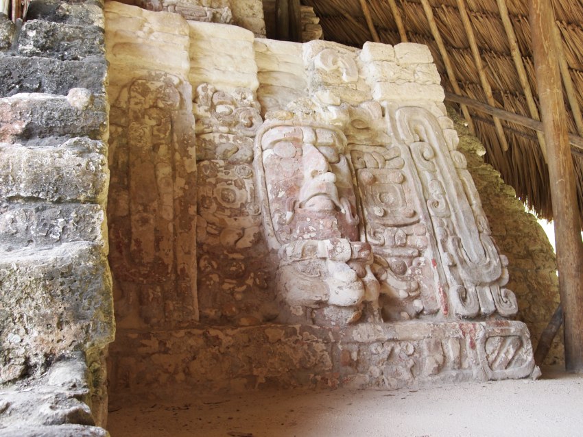 Am Fuß des Bauwerkes ist noch die rote Farbe zu sehen, mit der alle Gebäude der Mayas, auch in den anderen Städten, bemalt waren.