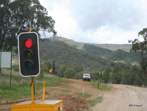 Die Durchfahrt durch den südlichen Teil des Parks ist allerdings nicht möglich. Wir müssen deshalb wieder zurück bis Narrabri und dann über die Sawn Rocks nach Osten fahren. Kurz vor dem Erreichen der Sawn Rocks müssen wir an dieser bemerkenswerten Baustelle mitten im Nichts warten.