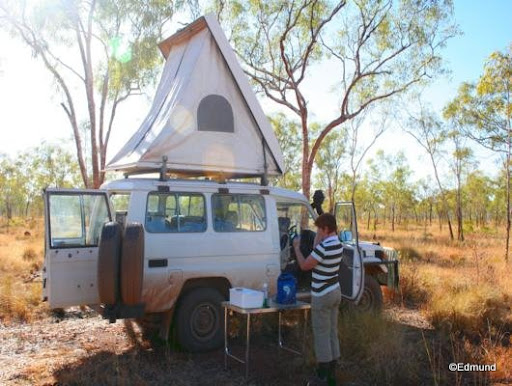 Sobald wir unseren Übernachtungsort erreicht hatten, wurde die Leiter angestellt und das Zeltdach mit leichter hydraulischer Unterstützung aufgeklappt. Dann machte die Hausfrau die Betten (Laken gerade ziehen und Luft in die Schlafsäcke rein lassen) und öffnete alle Fenster. Nur die Fliegennetze blieben herunter gerollt. Raus kullern war nahezu unmöglich, da die Zeltwand das verhinderte. Umständlich war nur, wenn wir mal nach Genuss einiger VB nachts raus klettern mussten - aber sonst alles easy.