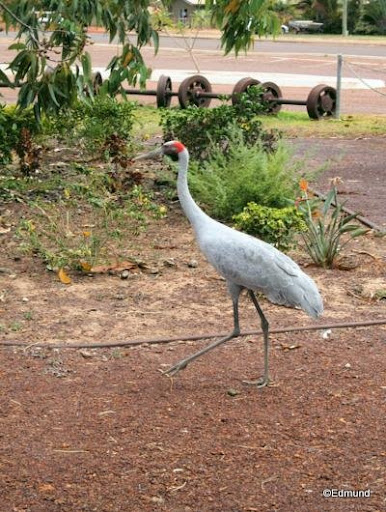 Plötzlich hören wir vom anderen Ufer Babygeschrei - hat hier jemand ein Kind ausgesetzt? Wir wollen nach schauen. Als wir gerade das trockene Flussbett überqueren wollen, fliegen ein paar Kakadus auf und das Geschrei hört auf. Als sich die Vögel auf einem anderen Baum erneut niedergelassen haben, beginnt es wieder. Und obwohl es sich um Gelbhaubenkakadus handelte, haben wir sie vorher nicht gesehen. Auf dem Rückweg zur Straße sehen wir dann noch diese großen Grauen, die sich in ihrer Pause nicht von uns stören lassen. Dabei fahren wir mit dem Auto nur vier Metern entfernt vorbei.
