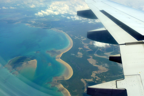 Der Flug verläuft ereignislos, wenn mal man davon absieht, dass in Australien anscheinend die Frühlingsferien begonnen haben und der Flieger komplett voll ist, und zwar auch voller Kinder. Fairerweise muss man sagen, dass sie sich offenbar abgesprochen haben und höchstens immer zwei Kinder gleichzeitig protestierend schreien und heulen, während genervte Mummys und Daddys es erst mit gutem Zureden und später mit energischen Worten probieren, wobei mir persönlich die Mummy am sympatischsten ist, die irgendwann anfängt, ihre Tochter nachzuäffen. Während wir uns Mackay nähern reißen ab und zu die Wolken auf und man kann ein wenig tropische Küste erahnen.