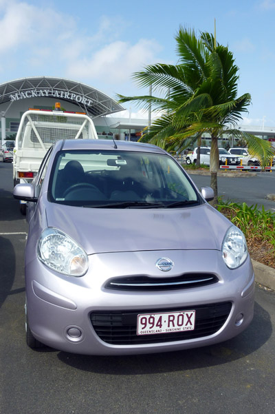 Trotz einer halben Stunde Verspätung in Sydney landen wir in Mackay fast pünktlich. Der kleine Airport kommt meiner Vorstellung von einem Domestic Terminal schon wieder sehr nahe, und ganz besonders reizend finde ich, dass die Schalter der Autovermieter gerade mal 20 m vom Gepäckband entfernt sind. Ich beginne also erst mal mit der Anmieteprozedur, und während die Mitarbeiterinnen bei Avis meine Buchung ausdrucken, kann ich meinen Koffer vom Band holen. Um halb drei spaziere ich schließlich mit dem Mietvertrag in der Hand hinaus zum Parkplatz, wo ein laut Papieren „purple“-farbener Micra auf mich wartet.