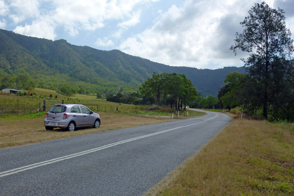 Schließlich verabschiede ich mich für die nächsten beiden Tage vom Meer und klettere in meinen kleinen Micra, mit dem ich zunächst noch den Parkplatz am kurzen Boardwalk in der Nähe ansteuere. Dann programmiere ich das Navi und mache mich auf den Weg zum Eungella Nationalpark. Auf dem Weg dorthin komme ich durch üppige Zuckerrohrfelder, sehe zumindest eine der Loks, die die Wagen mit der Ernte in die Sugar Mills bringen und halte schließlich auf Anraten meines Lonely Planet Reiseführers zu einem Mittagessen am Pinnacle Hotel an.