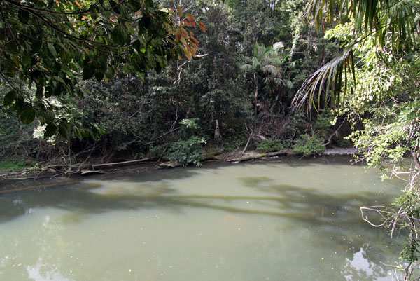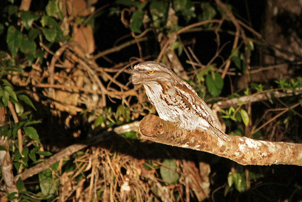 Was mich etwas beunruhigt ist allerdings die Tatsache, dass es hier vermutlich nicht nur eine einzige Python gibt, sondern vermutlich ein ganzes Rudel. Ich verlasse also mit etwas gemischten Gefühlen kurz vor acht mein Zimmer und gehe zum Treffpunkt für die Spotlight-Tour. Dort findet sich nach und nach eine kleine Schar von schlangentrotzenden Besuchern ein, die schließlich dem Ranger eine Stunde lang über die Wege rund um die Lodge folgen. Dabei sucht der Ranger immer wieder mit einer starken Lampe die Bäume und den Fluss ab, und tatsächlich wird er einige male fündig. Das scheint bei den Fundobjekten aber nicht unbedingt auf große Begeisterung zu stoßen.