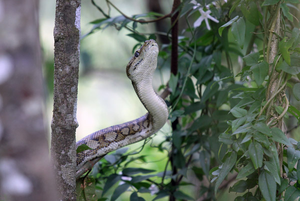 Als dann aber eine Stunde später die Rezeptionistin an den Lodges vorbeiläuft und den Leuten zuruft, dass unten neben dem BBQ eine Python im Baum hängt, bin ich natürlich wieder innerhalb von zwei Minuten in den Schuhen und aus dem Zimmer. Und tatsächlich, da ist sie. Nicht träge zusammengerollt irgendwo oben über einem Ast hängend, sondern in wenigen Metern Entfernung auf dem Weg durch die Büsche: