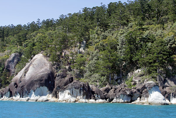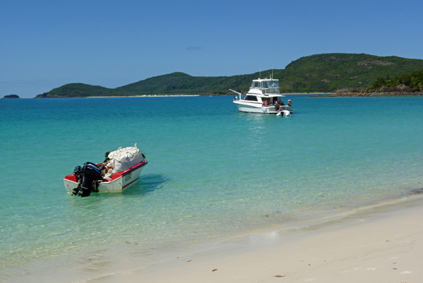 Ich bin völlig begeistert und kann mich kaum von dem Anblick trennen, aber nachdem jeder Gelegenheit hatte, nach Lust und Laune Fotos zu machen, wird es dann doch Zeit, unser nächstes Ziel anzusteuern, den Whitehaven Beach. Dort haben wir 2 Stunden Zeit zum Schwimmen, Relaxen, Spazierengehen, und ein BBQ am Beach wird auch noch angeboten. Zwar ist der Strand nicht gerade einsam, denn es liegen einige Schiffe hier vor Anker, die Ausflügler hergebracht haben, aber wenn man ein paar Meter weiter geht, kann man ungestört im kristallklaren Wasser schwimmen.