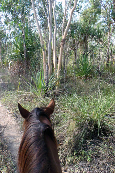 Um drei Uhr geht es los. In der Obhut von vier Begleiterinnen verlässt unsere Gruppe die Ranch und schlägt den Weg durch Busch und Palmenhaine ein. Kitaboy ist ein nettes, umgängliches Pferd, und meine reiterlichen Fähigkeiten reichen dann doch dafür aus, dass ich in die vordere Gruppe darf, die zwischendurch auch mal einen leichten Galopp einlegt. Nach etwa einer Stunde kommen wir dann am Strand an.
