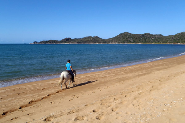 Auch wir Reiter haben uns in der Zwischenzeit quasi „abgesattelt“, also die Klamotten abgeworfen, und warten in Badesachen darauf, dass wir wieder die Rücken unserer Rösser erklimmen dürfen. Und dann reiten wir mit den Pferden wieder hinunter an den Strand und hinein in das wunderbare warme Wasser der Horseshoe Bay.