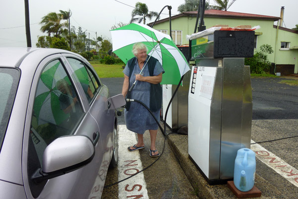Kurz vor Millaa Millaa mache ich dann mit einer unangenehmen Eigenschaft meines Autos Bekanntschaft: Eben noch wurde angezeigt, der Tank sei zu einem Viertel voll, dann gehen plötzlich mehrere Alarmlichter an und zeigen mir blinkend eine Reichweite von 50 km, und 5 km weiter blinken mir nur noch unheilvoll drei nichtssagende Striche entgegen. Ich sehe mich schon irgendwo am Straßenrand mit leerem Tank liegenbleiben, da erreiche ich zum Glück Millaa Millaa und rolle schon beim ersten „Fuel“-Schild von der Straße. Noch während ich das Auto parke, kommt die Inhaberin zum Auto und teilt mir mit, Zahlung sei nur per Cash möglich. Teurer als anderswo ist es natürlich auch. Dafür betankt die Inhaberin mein Auto sogar persönlich.