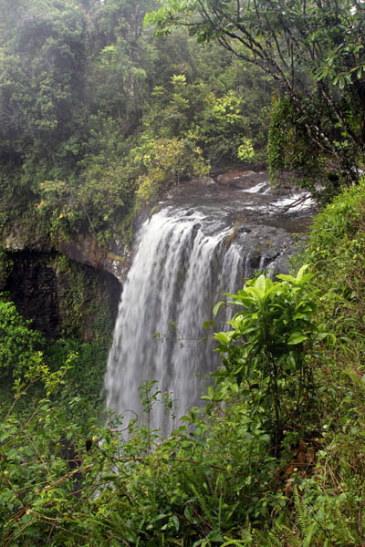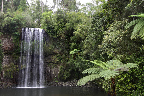 Aus den Schauern ist inzwischen ein gemeiner Landregen geworden, der mal stärker mal schwächer auf mich niederprasselt, während ich versuche, den drei Wasserfällen des Waterfall Circuits und der typischen Tierwelt der Atherton Tablelands halbwegs brauchbare Fotos abzutrotzen. Zum Glück ist mir ja gestern mein Känguruh-Hut zugelaufen, der wie versprochen ziemlich wasserdicht ist. So muss ich wenigstens nicht mit Schirm oder Kapuze herumlaufen.