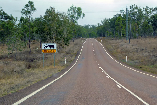 Unterwegs passiere ich Baustellen und schnurgerade Straße, Termitenhügel und Warnschilder. Eins dieser Schilder warnt vor Kühen, die Autos anfallen und fressen. Oder wie soll man das hier sonst verstehen?