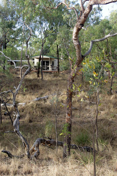 Um vier Uhr erreiche ich schließlich die Undara Experience Lodge, wo ich eigentlich in einem restaurierten Eisenbahnwaggon übernachten wollte. Dass mit meiner Buchung irgendetwas schiefgelaufen war, hatte sich erst vor ein paar Wochen herausgestellt, als ich zu meiner Übernachtungen noch zwei Touren buchen wollte und die Mitarbeiter merkten, dass für meine Buchung die falschen Daten erfasst waren. So wurde ich kostenlos in eine der Pioneer Huts upgegradet, und als ich sehe, wie schön meine Hütte mit eigener Terrasse am Rand zur Wildnis liegt, bin ich mit der Änderung sehr zufrieden.