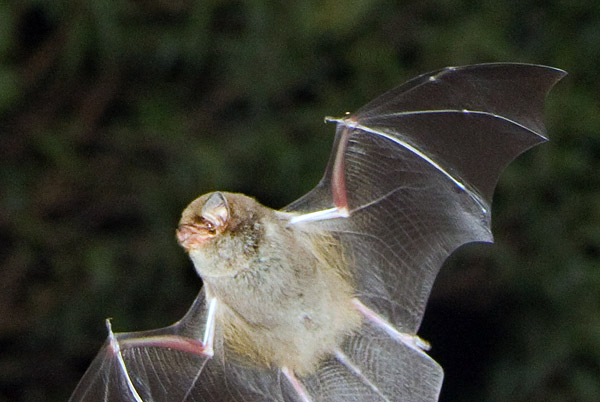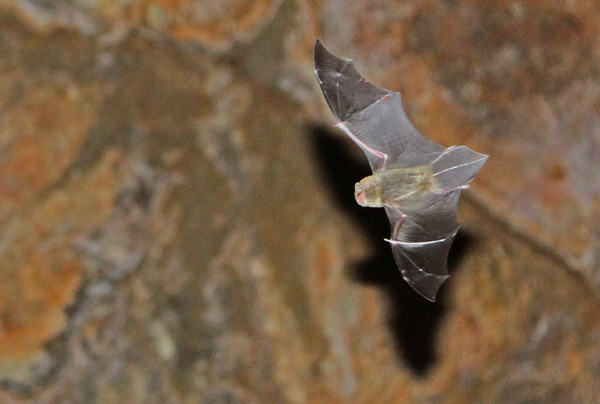 Dann geht die Fahrt weiter zu einer der Lavahöhlen, für die der Nationalpark bekannt ist. Die Fledermäuse verlassen die Höhlen bei Sonnenuntergang, um auf die Jagd zu gehen, und als wir am Höhleneingang ankommen, wimmelt es schon überall von kleinen schwarzen blitzschnellen Schatten, die in dem spärlichen Taschenlampenlicht um uns herumwirbeln. Schade, mit Fotos wird es hier nichts werden, denke ich noch, da erklärt die Rangerin das Prozedere: Sie macht die Lampe aus, und wir warten eine Weile in der Dunkelheit, sie zählt bis drei, dann macht jeder mit Blitzlicht Fotos, und dann warten wir wieder kurz ab, bis die Fledermäuse zurückkehren, um es nochmal zu probieren. Ich fingere noch schnell in der Dunkelheit am Objektiv herum, um den manuellen Fokus einzustellen, denn mit Autofokus wird die Kamera wahrscheinlich gar nicht erst auslösen. Dann mache ich jeweils „aus der Hüfte“ ein paar Bilder. Und obwohl ich es nicht geglaubt hätte, bekomme ich am Höhleneingang und etwas außerhalb der Höhle tatsächlich ein paar Fledermäuse halbwegs scharf vor die Linse:
