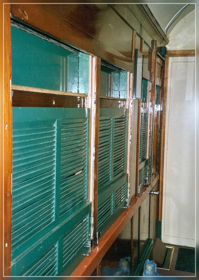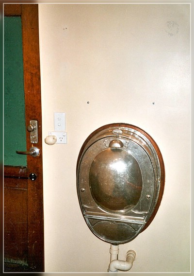 Hier das silberne Etwas. Wenn man den Deckel herunter klappte, fand sich ein Waschbecken mit fließend Wasser. Die Tür links daneben, von der ein Teil zu erkennen ist, führte überdacht in den nächsten Waggon.