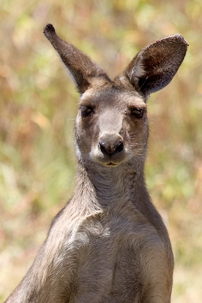 Ein Stück weiter, in einem Gebiet, in dem man nach Auskunft der Rangerin gute Chancen auf Wildlife hat, gehe ich schließlich langsam und nach allen Richtungen schauend den Weg entlang. Um mich herum singen und pfeifen die Vögel, aber dummerweise bekomme ich einfach keinen vor die Kamera und bin schon etwas frustriert. Dann sehe ich aber plötzlich rechts von mir ein paar Kängurus und pirsche mich vorsichtig heran. Es sind drei. Einer wacht in der Sonne, die anderen haben sich unter einen Eukalyptus in den Schatten geflüchtet.