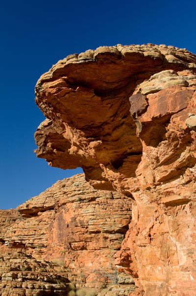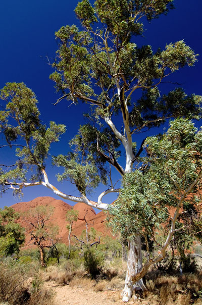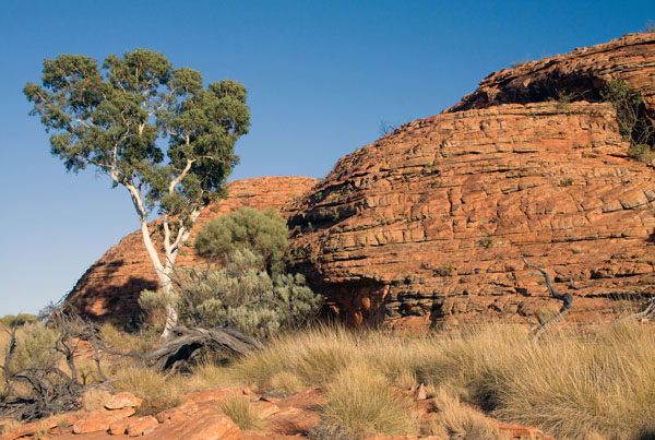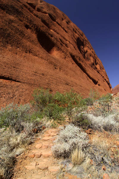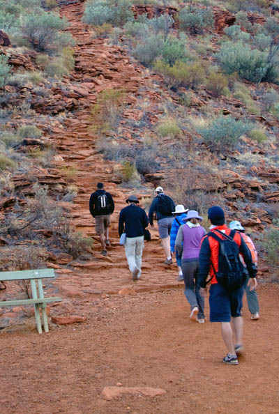 Auf dem ersten Teil der Wanderung durchs Valley of the Winds begleitet uns der Guide, erklärt einiges zu verschiedenen Pflanzen, aber auch zur Bedeutung der Kata Tjuta für die Aborigines. Die Kata Tjuta haben für die Aborigines einen noch höheren Stellenwert als der Uluru, und das Wissen über die hier präsenten Wesen darf nicht an Uneingeweihte weitergegeben werden. Wenn ich es richtig verstehe, werden die Kata Tjuta auch heute noch für Zeremonien genutzt. Es darf mit den Kata Tjuta auch nicht geworben werden, sondern sie dürfen nur als „Anhängsel“ zum Uluru erwähnt werden.