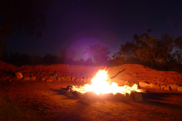 Zwischenzeitlich hat der Guide Würstchen gebraten und legt jetzt Känguru-Steaks auf. Das Brot ist fertig, und auch wenn es außen ziemlich schwarz ist, schmeckt es lecker, genauso wie das Känguru-Steak und das Kartoffelgratin à la Outback. Später sitzen wir ums Lagerfeuer, rösten Marshmallows und schauen in die Sterne. Als ich nach dem berühmten Kreuz des Südens frage, wird das Sternbild von jedem anwesenden Australier woanders lokalisiert. Unser Guide meint schließlich, es wäre noch gar nicht aufgegangen. ;-)