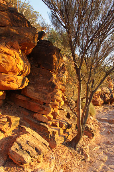 Nach einem kleinen Frühstück fahren wir dann dick eingemummelt zum Kings Canyon. Vor der Wanderung dort hatte ich vor der Reise einen Riesenrespekt. Die Steigung, die man am Anfang bewältigen muss, ist als „Heartattack Hill“ berühmt-berüchtigt. Ich hatte befürchtet, mich unter gleißender Sonne bei 38 Grad im Schatten dort hinaufquälen zu müssen, während mir die Sonnencreme in die Augen läuft. Stattdessen kommt die Sonne gerade erst über den Horizont, einige aus der Gruppe tragen sogar Mützen und Handschuhe, und die etwa 400 Stufen des Heartattack Hills sind in 15 Minuten bewältigt.