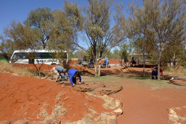 Gegen halb elf kommen wir zum Bus zurück, wo der Guide mit frisch geschnittenem Obst auf uns wartet. Lecker. Dafür helfen wir dann auch später bei der Zubereitung des Mittagessens kräftig mit. Traditionsgemäß versammeln sich die Männer um den Grill und braten Fleisch, und wir Frauen schneiden Gemüse für die Wraps. Beim anschließenden Abwasch reißen wir uns dann quasi gegenseitig die gespülten Teller aus den Händen, um sie abzutrocknen. Es ist eine nette Truppe, mit der ich da unterwegs bin, und von der Familie mit zwei Töchtern aus Alice Springs über den Studenten aus Japan bis zu zwei Frauen im fortgeschrittenen Rentenalter aus England sind alle Altersstufen und viele Länder vertreten.