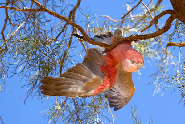 Dann beginnt die über fünfstündige Rückfahrt nach Alice Springs. Unterwegs halten wir wieder in Erldunda und schließlich noch an einer Kamelfarm, wo einige aus der Gruppe einen kurzen Kamelritt unternehmen. In der Nachmittagssonne fliegen Papageienschwärme von Baum zu Baum, und mancher Papagei findet mich offenbar genau exotisch wie ich ihn. Der hier wäre vor Neugier beinahe vom Ast gefallen.
