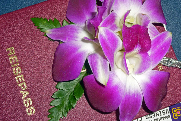 Wie schon auf dem Flug von Frankfurt nach Bangkok gibt es auch hier zum Abschied ein kleines, völlig unhandliches Orchideen-Gesteck, das bei der anschließenden Sicherheitskontrolle ein Stirnrunzeln des Schweizer Mitarbeiters auslöst.