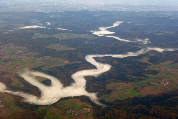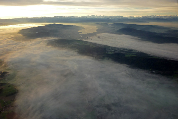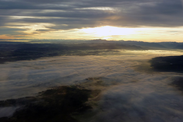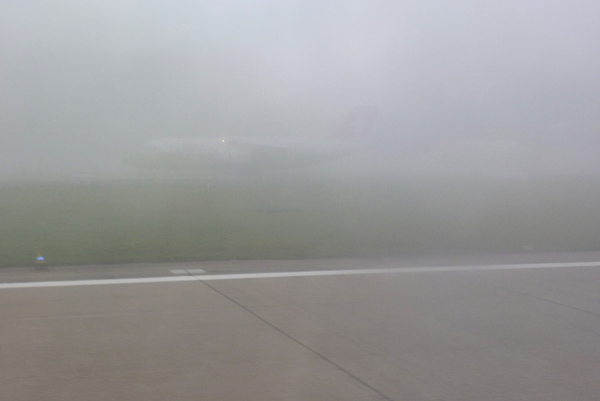 Das Flugzeug rollt pünktlich zur Startbahn. Immer noch ist es neblig und man kann kaum den Flughafen erkennen. Aber dafür bietet sich dann über dem Nebel ein umso schönerer Blick.