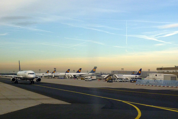 Nachdem ich so ziemlich den kompletten Züricher Flughafen inkl. Sicherheits- und Passkontrolle kennengelernt habe, wobei das besondere Highlight eine kurze Fahrt mit einem Shuttle ist, die akustisch mit Kuhgemuhe, Glockengebimmel und Alphornfanfaren untermalt ist, komme ich schließlich um kurz nach halb acht am Gate A64 an, wo dann auch um acht Uhr das Boarding für den Lufthansa-Flug nach Frankfurt beginnt. Hier „muss“ ich Business fliegen, denn First gibt’s auf dem kurzen Zubringerflug nicht. Igitt.
