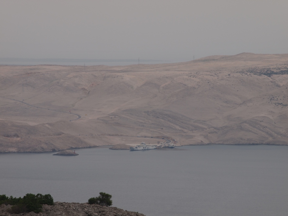 Weiter ging es auf der Küstenstraße. Die langgezogene, kahle an eine Mondlandschaft erinnernde  Insel Pag bestimmt die Aussicht.