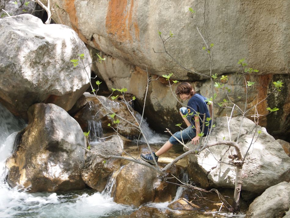 In 14 Tagen wird nicht mehr viel zu sehen sein, dann ist bereits alles zugewachsen. Bei so einem Wasserfall legten wir unsere Mittagsrast ein. Florian nutzte das zu einer kleinen Kletterei.