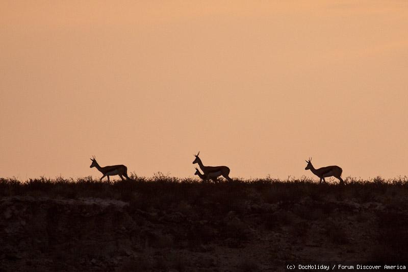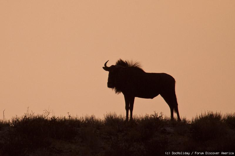 Heute morgen mal kein kitschig bunter Sonnaufgang sondern ein paar Scherenschnitte. War doch nett von den Gnus und Springböcken, sich auf dem Dünenkamm aufzureihen.