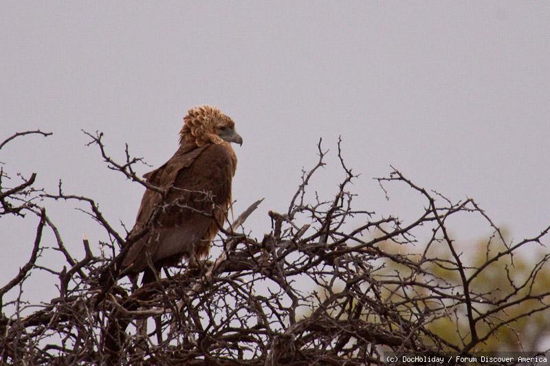 Auf dem nächsten Baum sass mal wieder ein Vogel, der Mitleid mit mir hatte und sitzen geblieben ist. Ich denke, dass es sich um einen jungen Bateleur (Gaukler) handelte.