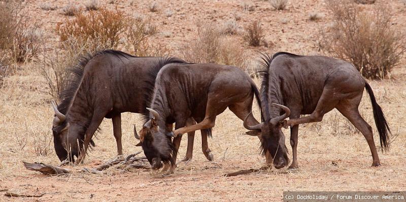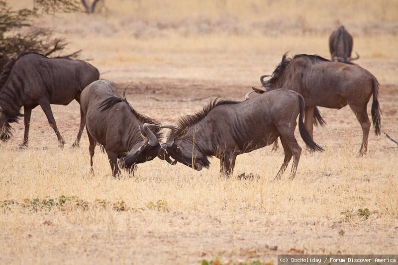 Nach Gemsbock und Straußen traf ich auf eine Gruppe Gnus, wo einige der Bullen extra für mich ein Unterhaltrungsprogramm aufgelegt hatten.