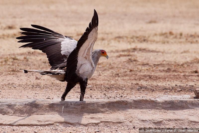 Ich fand das eine gute Idee und fuhr nach Mata Mata um ein wenig Siesta zu halten. Unterwegs sah ich noch diesen Sekretär an einem Wasserloch.