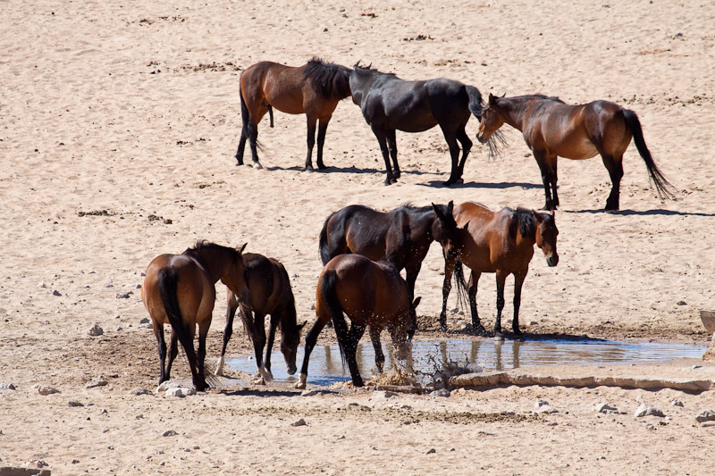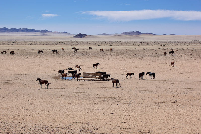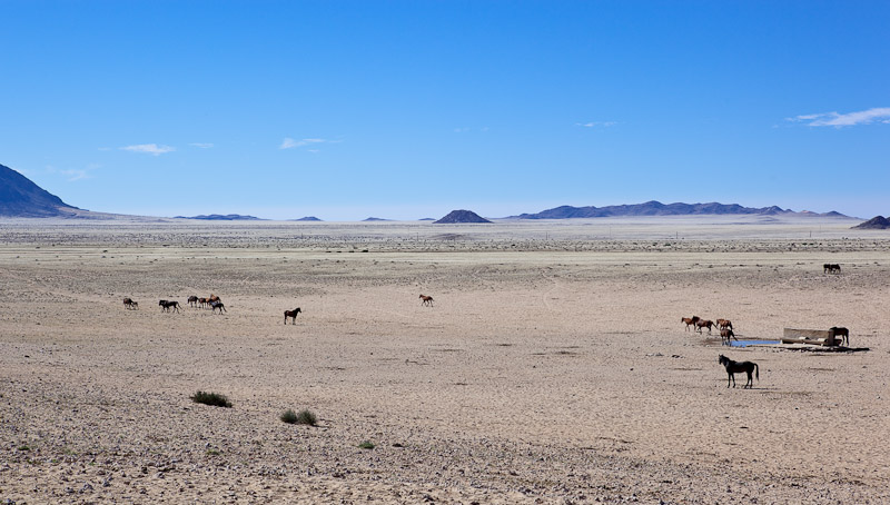 Bei Gharub gibt es ein Wasserloch, an dem man sie fast jeden Tag zu Gesicht bekommen kann. Von der Straße nach Lüderitz rumpelt man ein paar km über eine zimelich holprige Schotterpiste zu einem Parkplatz mit einem überdachten Beobachtungsstand. und tatsächlich waren im weiteren Umkreis des Wasserlochs über 100 Pferde zu sehen.