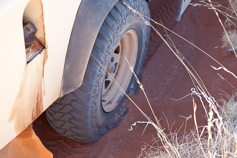 Als nächstes stellte sich heraus, dass der Wagen zwar mit zwei Ersatzrädern und einem stabilen High-Jack ausgestattet war aber leider nicht mit einem passenden Schraubenschlüssel. Also wurde über Funk Hilfe herbei gerufen, während Denish sich über seine schlampigen Kollegen ausließ. Wenn er mal nicht selber derjenige war, der das Teil irgendwo liegen gelassen hat . Bei seiner Fahrweise waren Plattfüße sicher an der Tagesordnung ;).