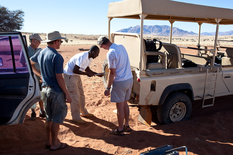 Nach etwa 20 Minuten tauchte Wilhelm von der benachbarten Farm auf. Leider passte sein Kreuzschlüssel nicht und er verschwand wieder, um mehr Werkzeug zu holen. Beim zweiten Versuch hatte er sicher 7 oder 8 verscheidene dabei und einer passte auch. Während er den Reifen wechselte, musste Denish sich jede Menge Frotzeleien von Wilhelm und seinem Helfer anhören (der Herr rechts mit dem weißen T-Shirt, auf dem übrigens Gymnasium Konstanz stand). Wilhelm fuhr nämlich einen Land Cruiser und hat kräftig über Land Rover gelästert. An der Stoßstange seines Autos pappte ein netter Aufkleber mit der Aufschrift "Land Rover Trauma Center", darunter 7 Striche. Einen für jeden Land Rover, dem er schon Erste Hilfe geleistet hatte  :gg: