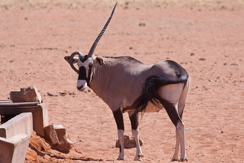 Am Wasserloch war inzwischen ein etwas deformierter Oryx aufgetaucht. Das krumme Horn ist wohl eine Art Missbildung.