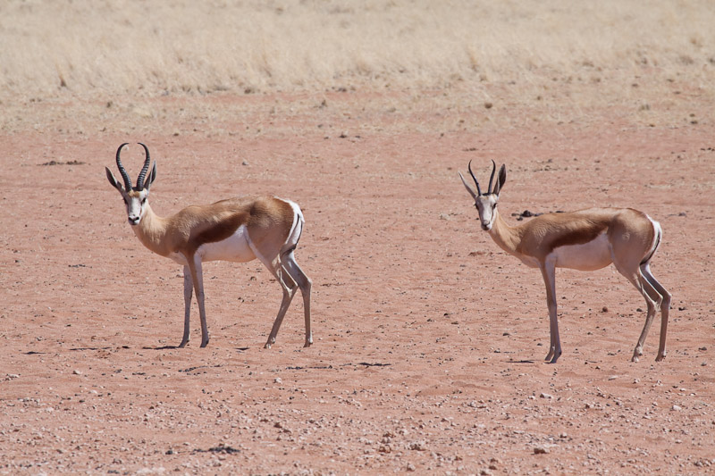 Die nächste Stunde verbrachten wir damit, kreuz und quer durch die Landschaft zu gurken und Giraffen zu suchen. Am Wasserloch waren sie nicht, an den Stellen mit den schönsten Bäumen leider auch nicht. Nach einer ganzen Weile meinte Aldred, dass es Zeit wäre umzudrehen, weil wir noch eine ordenliche Strecke zurück zu fahren hätten. Zumindest ein letzter Versuch beim Wasserloch war aber noch drin. Dort sahen wir zwar diverse Springböcke aber keine Giraffen.