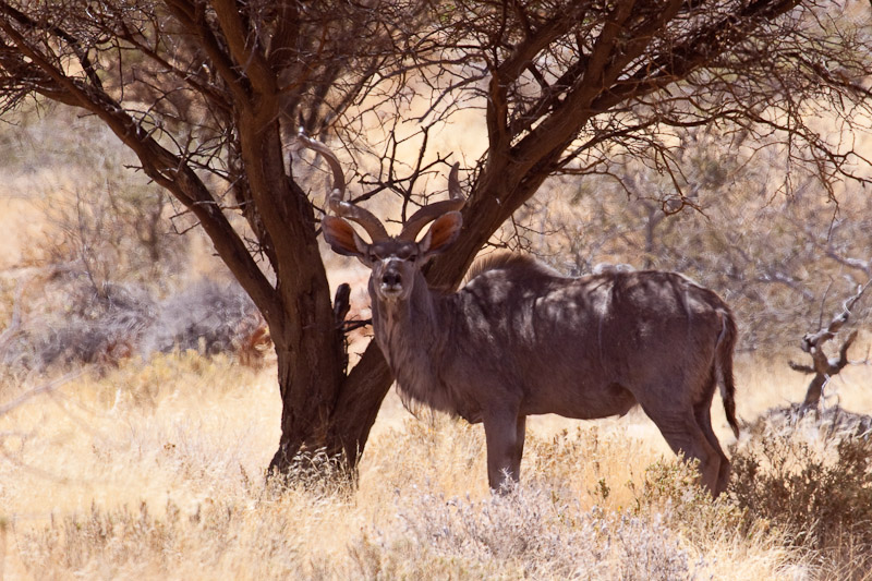 Kurz nach dem Lunchspot sahen wir zwei Kuduböcke, die Schatten unter einem Baum suchten. Der eine verschwand sofort aer der zweite wartete zumidest lange genug für ein Foto.
