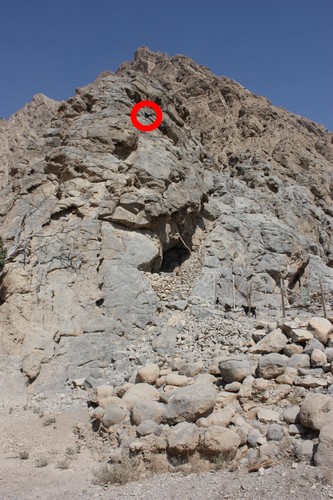 Tatsächlich entdeckt er einige, eine davon ist fast ganz oben auf einem riesigen Felsen. Von unten sieht man sie kaum, aber mit Teleobjektiv lässt sich eindeutig der Beweis erbringen, dass der schwarze Punkt in dem roten Kringel eine Ziege ist. Wahnsinn, wie gut so stinknormale Hausziegen klettern können.