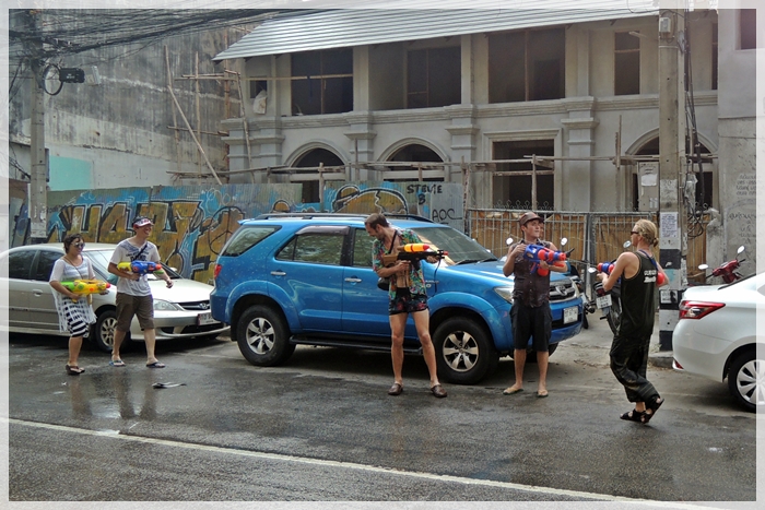 Aus Angst um meine liebste Nikon D7000 hatte ich nur meine kleine Cybershot mitgenommen, aber selbst die habe ich lieber die meiste Zeit in einer wasserfesten Tasche gelassen. Wenn man so durch die Straßen läuft oder mit dem Roller fährt kommt nämlich nicht nur mal ein kleiner Wasserstrahl aus einer niedlichen Wasserspritzpistole, nein, da bricht das Wasser eimerweise über einen herein und das von allen Seiten. Also Kamera weg und Gegenattacke!