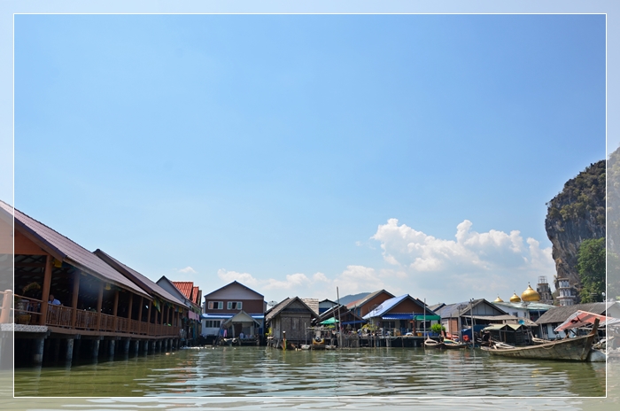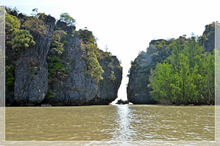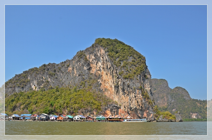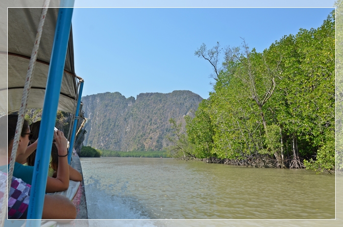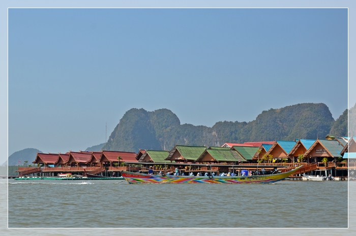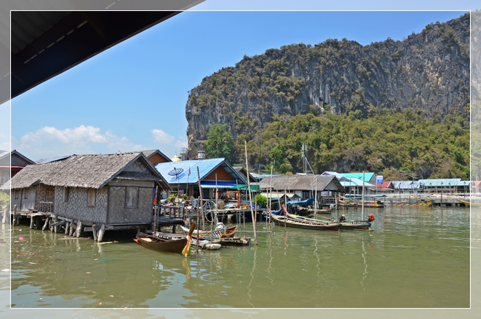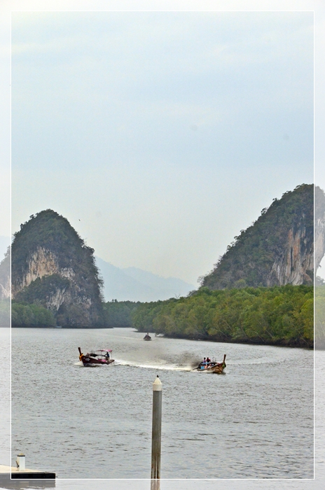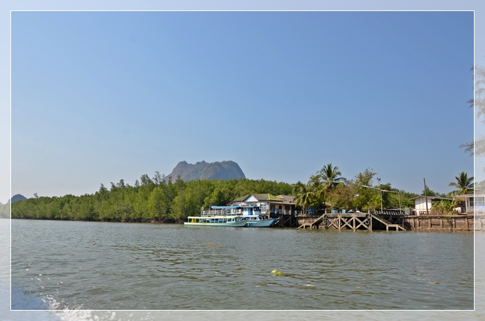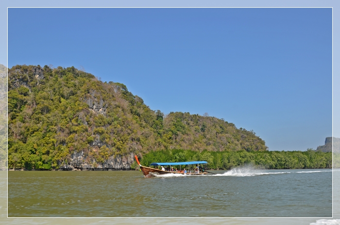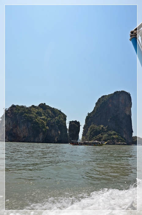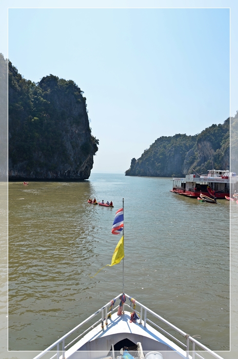 Was bei mir auch noch recht weit oben in der Liste stand war der „James Bond-Felsen“. Ein Teil von „Der Mann mit dem goldenen Colt“ wurde dort gedreht und da ging es dann auch als nächstes hin. Da wir das Speedboat ja schon ausgetestet hatten, haben wir uns diesmal für eine Fahrt mit dem Longtail-Boot entschieden. Auch nicht schlecht. Und es ist sogar alles gut gegangen (ich finde ja immer, dass die aussehen wie selbst gebastelt und nur bedingt seetüchtig, aber naja…). Die Tour startete weiter im Norden, das heißt wir mussten erst einmal eine Weile mit dem Minivan fahren, bis es wir ins Boot umgestiegen sind. Aber dann ging es recht gemütlich durch die zerklüftete Bucht zwischen Krabi und Phuket, vorbei an einer schwimmenden Stadt wo es später auch Mittagessen gab, und mit einem Zwischenstopp bei Talu Island wo man kurz ins Kanu umsteigen konnte so man denn wollte, auf zur James Bond Insel.