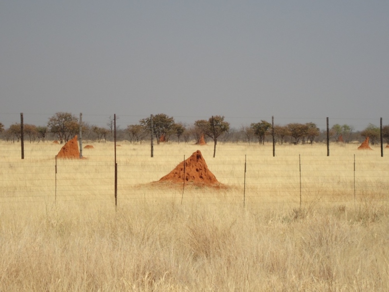 Bis Outio ging es zügig dahin. Wir wussten, dass es in diesem Ort einen Bankomaten gab, von dem auch wir Geld abheben konnten. Im Ort war viel los. Auch die Namenfragenden gab es hier. Wir gaben keine Namen mehr bekannt, da wir keine weiteren Schllüsselanhänger-Nüsse gebrauchen konnten. Getankt wurde auch noch schnell. Wir tankten nicht mehr voll, da wir wahrscheinlich nicht mehr so viel fahren werden. Auf dem Weg zum Andersson Gate waren diesmal rote Termitenhügel zu sehen.