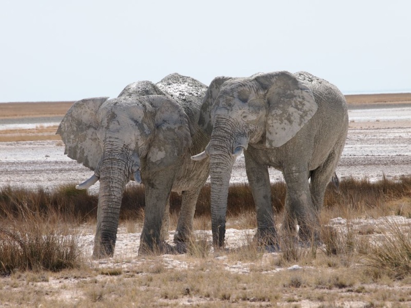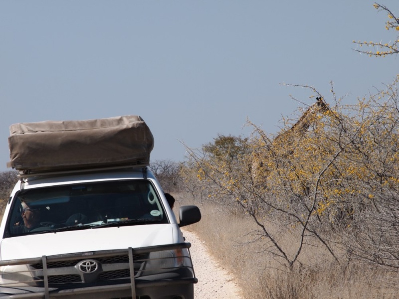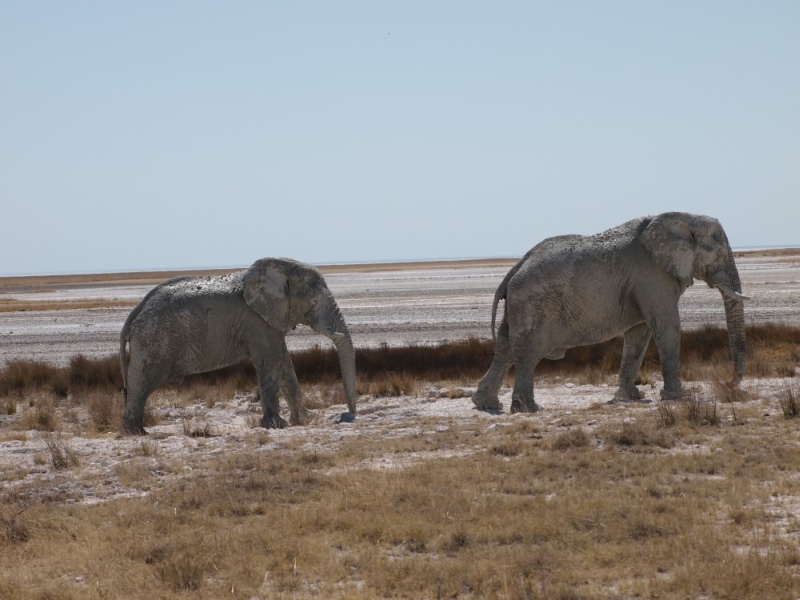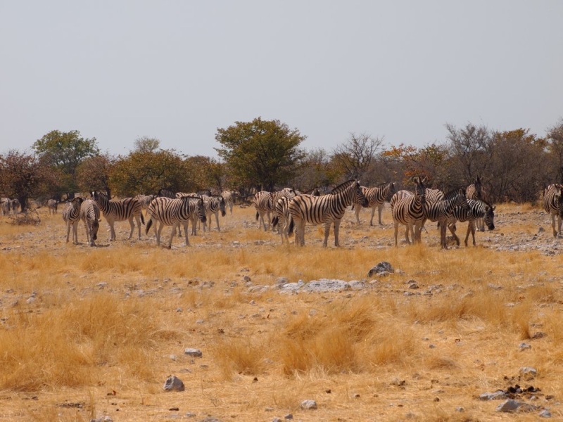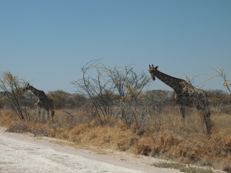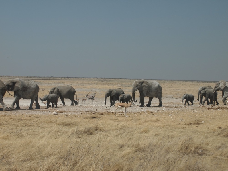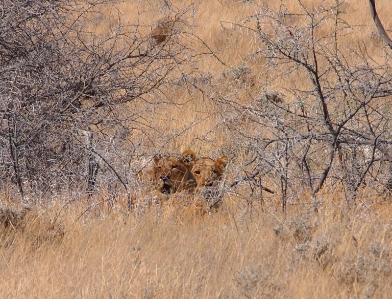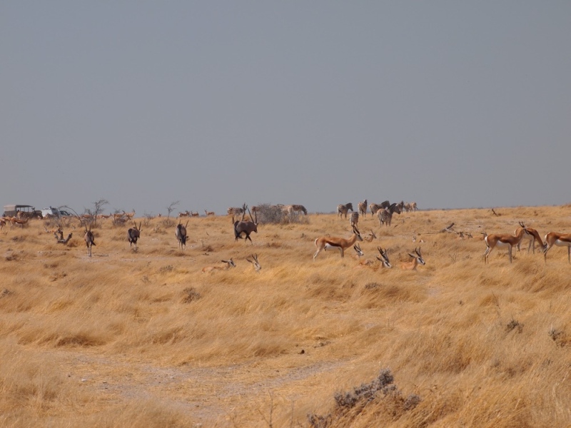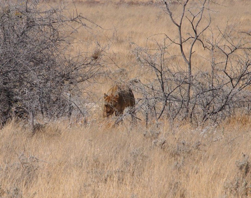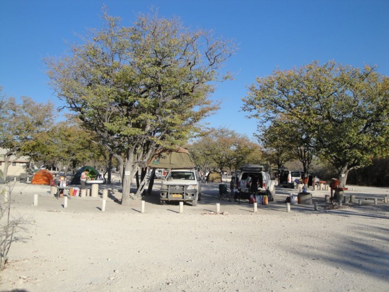 kamen und gingen in den 15 Minuten die wir am Parkplatz vor dem Wasserloch gestanden sind. Die Tiere sind nicht scheu und lassen sich nicht aus der Ruhe bringen. Auch nicht durch den Autoverkehr. Nach dieser Ouvertüre fuhren wir zum Rest Camp Okaukuejo um unseren Eintritt zu bezahlen und die Campingplätze zu belegen. Natürlich wieder Listen, Listen, Listen. Auf unseren Plätzen nahmen wir unsere Mittagsjause ein. Am frühen Nachmittag gingen wir auf die Pirsch. Wir fuhren Richtung Olifantsbad. Heike hatte im Park Office gelesen, dass in der Gegend Löwen gesichtet wurden.