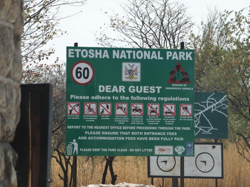 Beim Gate musste wieder ein Fragebogen ausgefüllt werden. Dieser wurde von der Rangerin abgezeichnet. Mit diesem Bogen muss man dann in Okaukuejo den Eintritt bezahlen. Darf man hier überhaupt etwas?