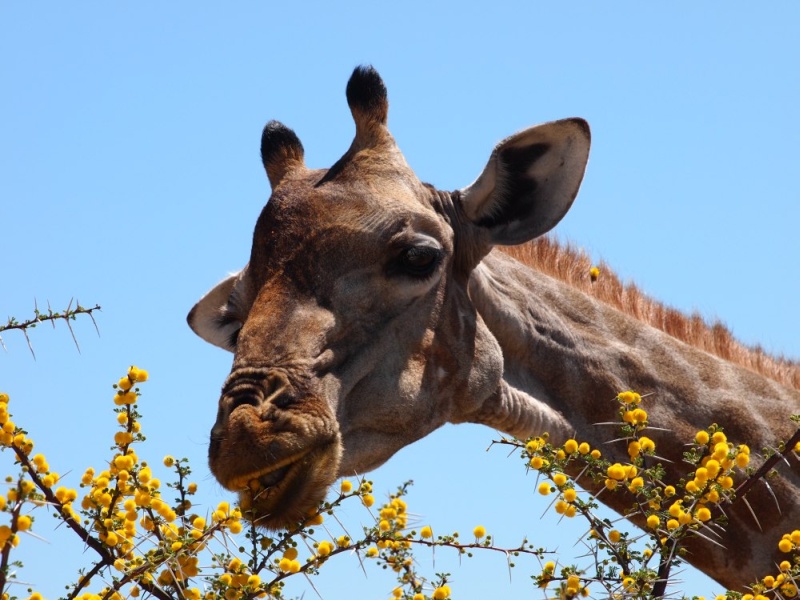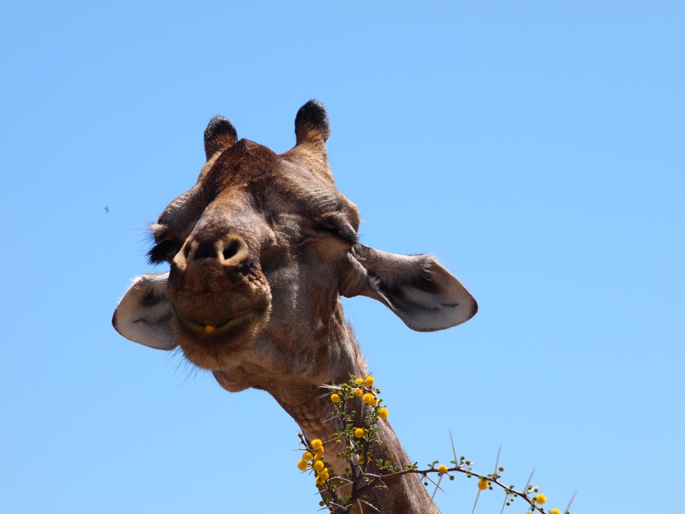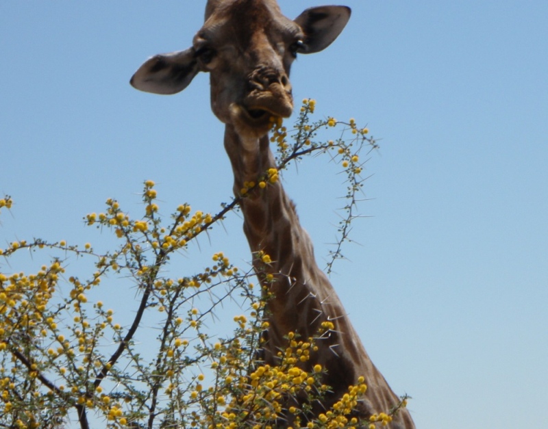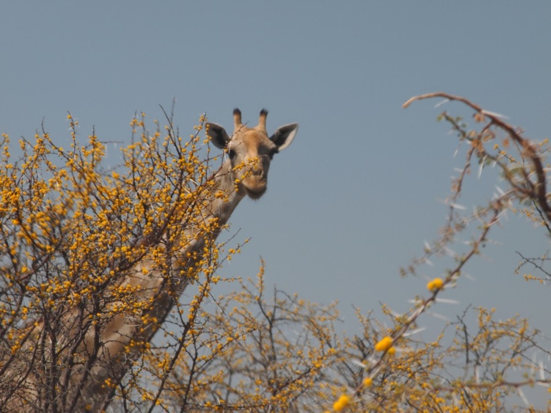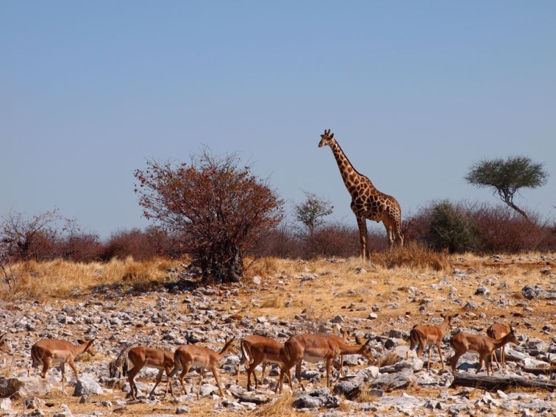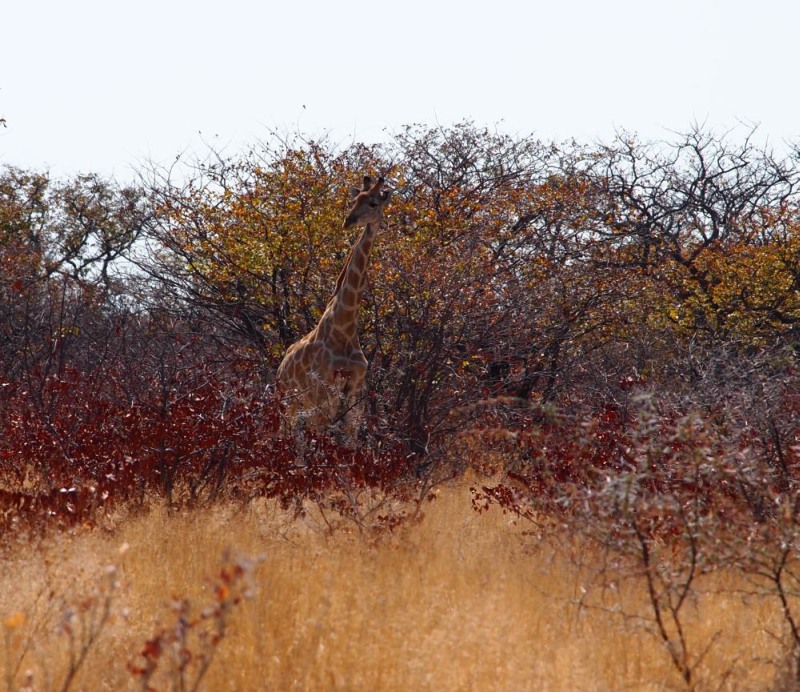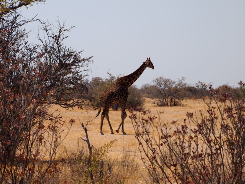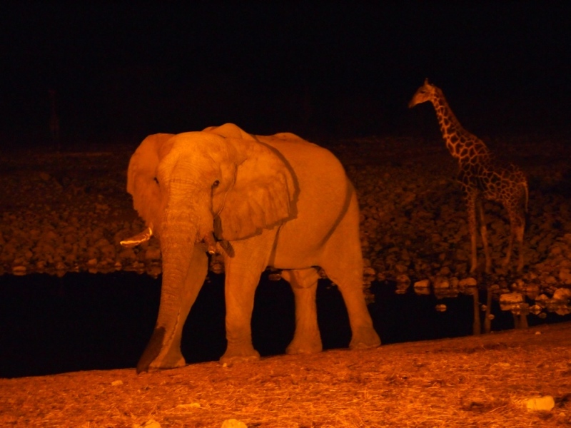 Auf dem Rückweg zum Restcamp sahen wir am Wasserloch Nebrownii an einem Ende einen Elefanten und am anderen eine Giraffe.