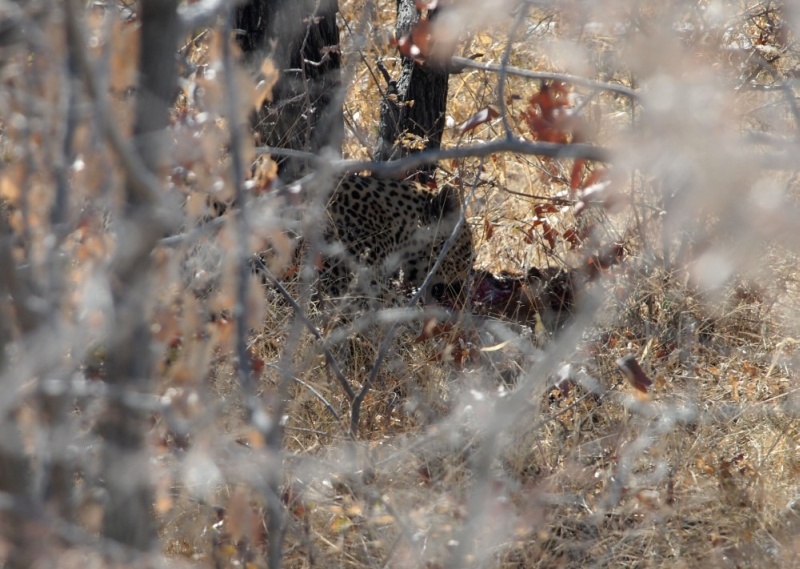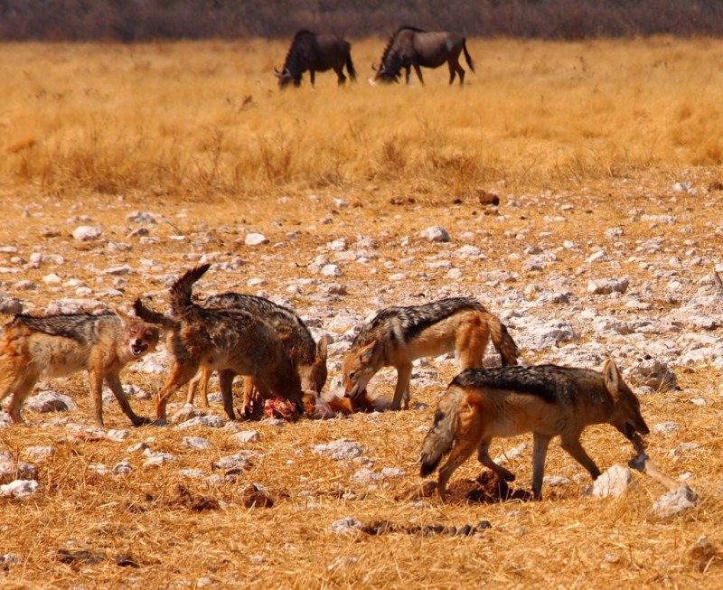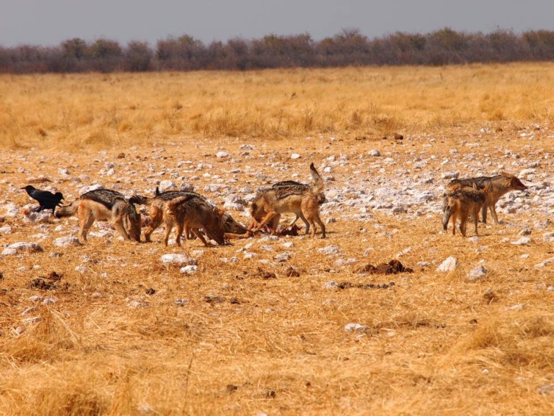Beim ersten Wasserloch Gemsbokvlakte erwischten wir ein Rudel Schakale, die gerade ein Tier zerlegten.