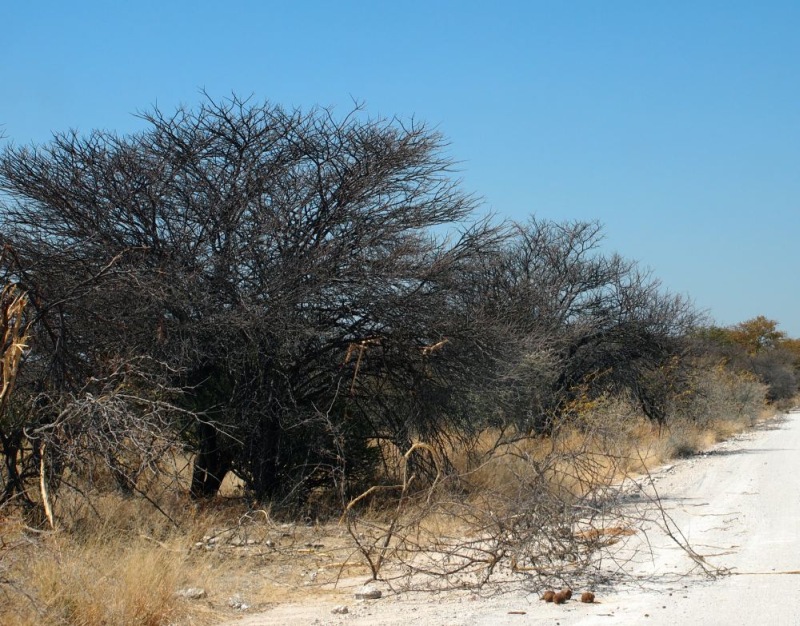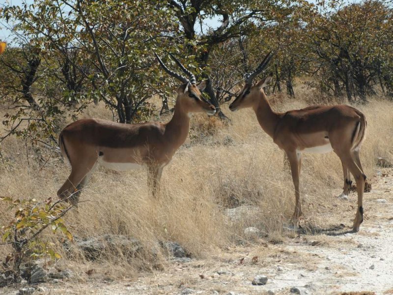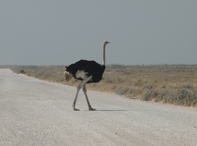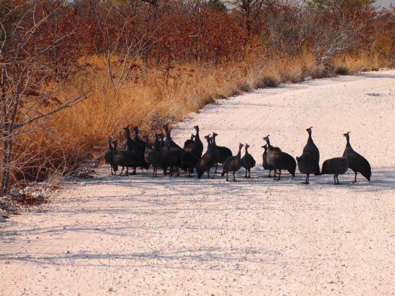 Beim Wasserloch von Olifantsbad war wenig los nur ein paar Springböcke. Das mit Zäunen gesicherte WC, das sich hier befindet, ist keinen Besuch wert. Wir fuhren weiter Richtung Aus. Auf der Straße war immer mehr frischer Elefantendung zu sehen. Auch abgebrochene Zweige lagen auf der Straße. Perlhühner suchten Schutz im Schatten und mussten umfahren werden.