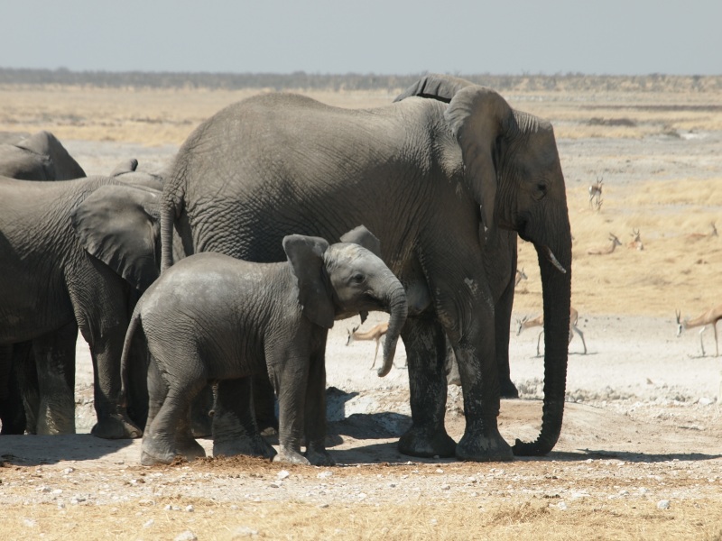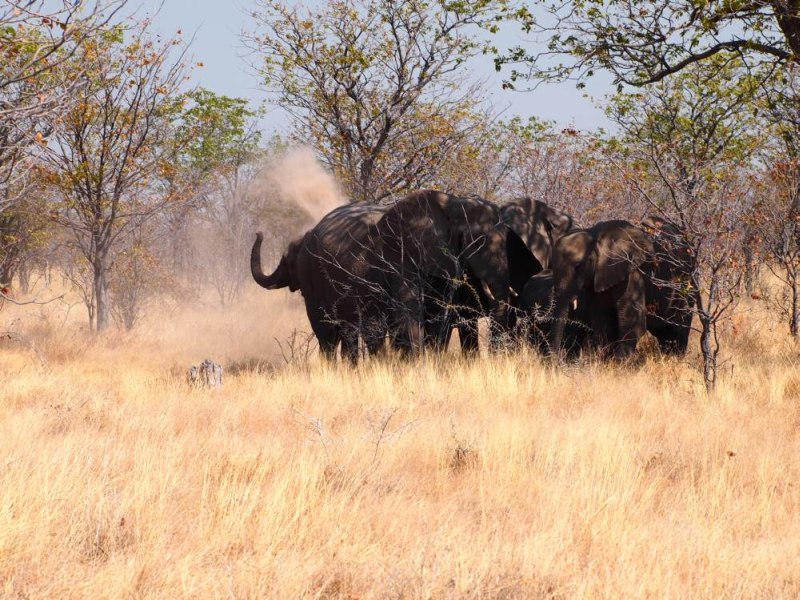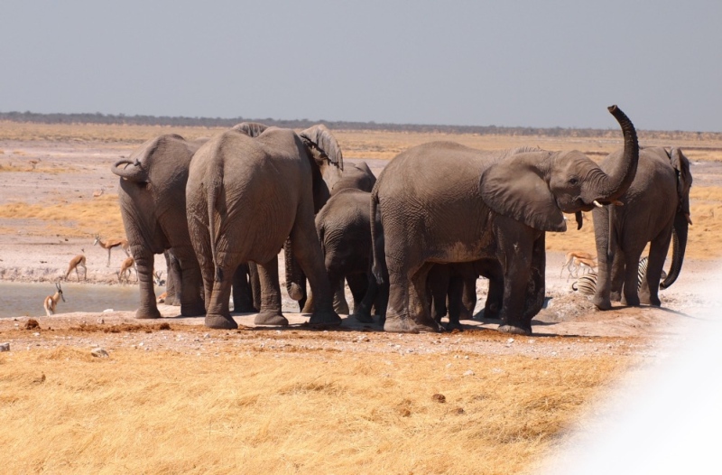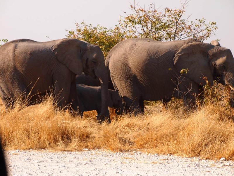 Wir waren nun von Elefanten umringt und saßen sehr angespannt im Auto. Im Kopf die Warnung des Hausherrn der Bambatsi Lodge und andere Geschichten, die wir vorab so gehört und gesehen haben. Sogar unser Jüngster war so beeindruckt, dass der das Dauerplappern vollkommen vergaß. Die Elefanten hatten Zeit. Uns kam es vor als ob der Strom aus dem Gebüsch nicht enden wollte. Vor uns, hinter un,s links und rechts Elefanten in allen Größen. Sie beobachteten uns zwar sehr aufmerksam, vor allem die Mütter mit den Jungtieren, wirkten aber nicht aggressiv. Als fast alle am Wasserloch waren und nur noch 3 hinter uns und die Straße wieder frei war, fuhren wir vorsichtig weg. Ein paar Kilometer weiter warteten Dietmar und Margit. Sie waren ziemlich in Sorge, da wir so lange nicht aufgetaucht waren. Dieses wunderbare Erlebnis mit diesen imposanten Tieren wird uns wohl auf ewig in Erinnerung bleiben.